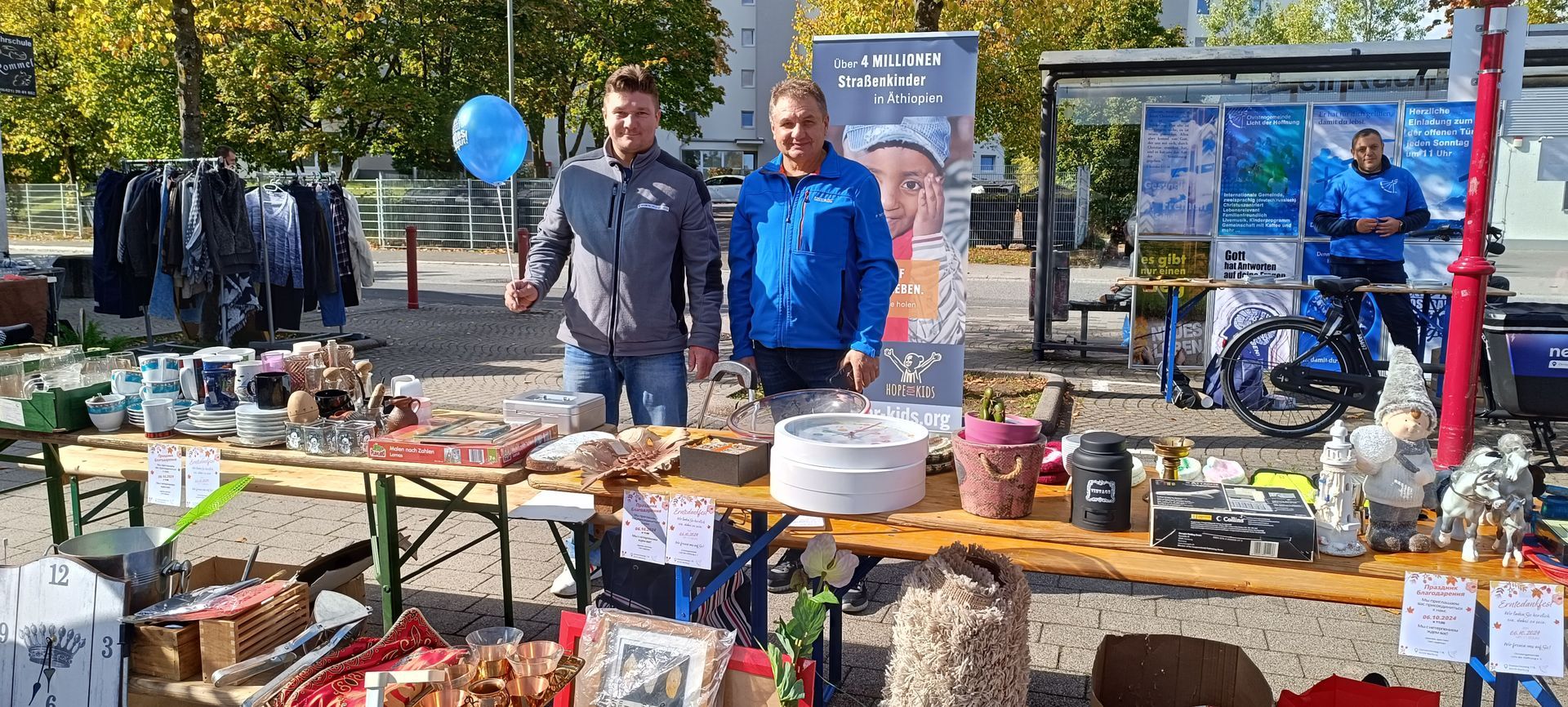 An diesem sonnigen Tag war neben dem Flohmarktverkauf der Fokus auf die Begegnung verschiedener Menschen von groß bis klein, von jung bis alt und die daraus entstehenden Gespräche. Dabei wurden Broschüren oder Einladungen zum Erntedankfest verteilt oder sehr viele Luftballons mit der Aufschrift: „Du bist kostbar in Gottes Augen“ den Kindern verschenkt. Wir sind Gott dankbar für jede Begegnung die wir mit den Menschen hatten und beten dafür, dass der Same Gottes in den Herzen der Menschen aufgeht und viel Frucht bringt.